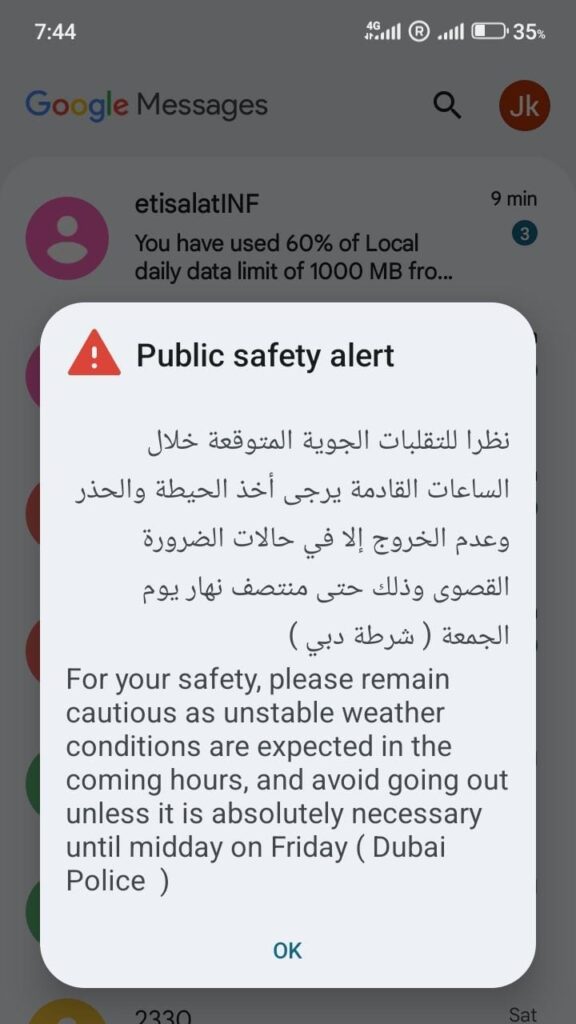 जालंधर/दुबई । Dubai Weather : लोगों को दुबई की तरफ से मौसम को लेकर अलर्ट पर रहने को कहा गया है। पंजाबी सहित हर भाषा में दुबई के प्रशासन ने लिखित सन्देश और हिदायतें जारी की हैं। लोग दुबई से बाहर इन संदेशों को सगे सम्बन्धियों या फिर दोस्तों के साथ शेयर कर रहे हैं।