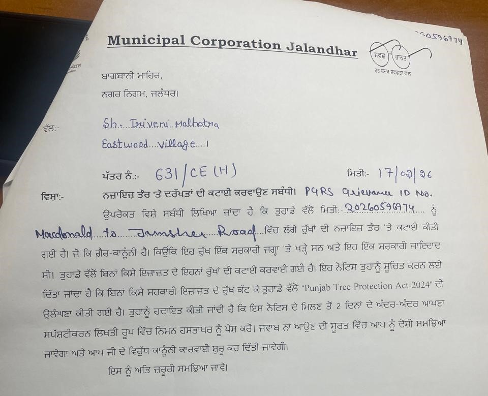 निगम द्वारा जारी आधिकारिक नोटिस के अनुसार, EASTWOOD VILLAGE के त्रिवेणी मल्होत्रा को भी शिकायत के आधार पर नोटिस भेजा गया है। नोटिस में बताया गया है कि मैकडॉनल्ड से जमशेर रोड के बीच पेड़ों की अवैध कटाई की गई, जिसकी शिकायत संबंधित विभाग को प्राप्त हुई थी। सूत्रों की मानें तो, जांच के दौरान यह सामने आया कि करीब 200 पेड़ों को काटा गया, जो कि “Punjab Tree Protection Act-2024” का उल्लंघन है। अब अगर EASTWOOD VILLAGE को प्रति पेड़ जुर्माना भरना पड़ा तो रकम ONE CRORE होगी।