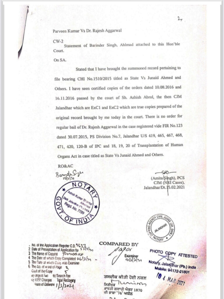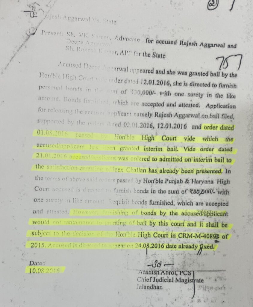 कोर्ट के कागज कहते हैं, अहलमद ने ट्रायल कोर्ट में 15.2.2021 को लिखित बयान दिया कि 10.8.2016 को ट्रायल कोर्ट ने डॉ. राजेश अग्रवाल को कोई रेगुलर बेल नहीं दी। माननीय presiding judicial officer आशीष अबरोल (CJM) ने इस दिन के ऑर्डर में साफ-साफ लिखा कि हाज़री के आदेश को, या जो भी बांड भराये गए हैं, का मतलब ये बिलकुल न समझा जाये कि इस अदालत ने डॉ राजेश अग्रवाल को कोई बेल दी है। बल्कि किडनी कांड में जमानत का अंतिम आदेश वही माना जायेगा जो हाई कोर्ट में चल रही एप्लीकेशन (CRM-M-40893 , 2025) में आएगा। हाई कोर्ट ने जमानत की अर्जी को ‘जनहित को सर्वोपरि’ रखते हुए 16-08-2016 को ख़ारिज कर दिया। इस फैसले का सीधा अर्थ है कि इस डिस्मिसल के बाद इससे पहले किसी भी तरह की अंतरिम या हाज़री का फैसला खुद-ब-खुद खत्म हो जाते हैं। इसमें 10.8.2016 का आर्डर भी था।