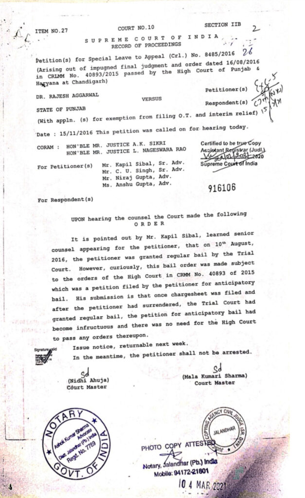 इसके बाद आरोपी डॉक्टर राजेश अग्रवाल ने सुप्रीम कोर्ट का रुख किया और अधिवक्ता कपिल सिब्बल ने सुप्रीम कोर्ट को बताया कि 10.8.2016 को ट्रायल कोर्ट ने राजेश अग्रवाल को रेगुलर बेल दे दी थी तो हाईकोर्ट में (CRM-M-40893 , 2025) में ख़ारिज की गई जमानत का कोई अर्थ नहीं रह जाता। हालांकि दोनों आदेश पढ़ने के बाद यह स्पष्ट है कि तिथि 10.8.2016 को किसी भी तरह की रेगुलर बेल नहीं दे गई थी।