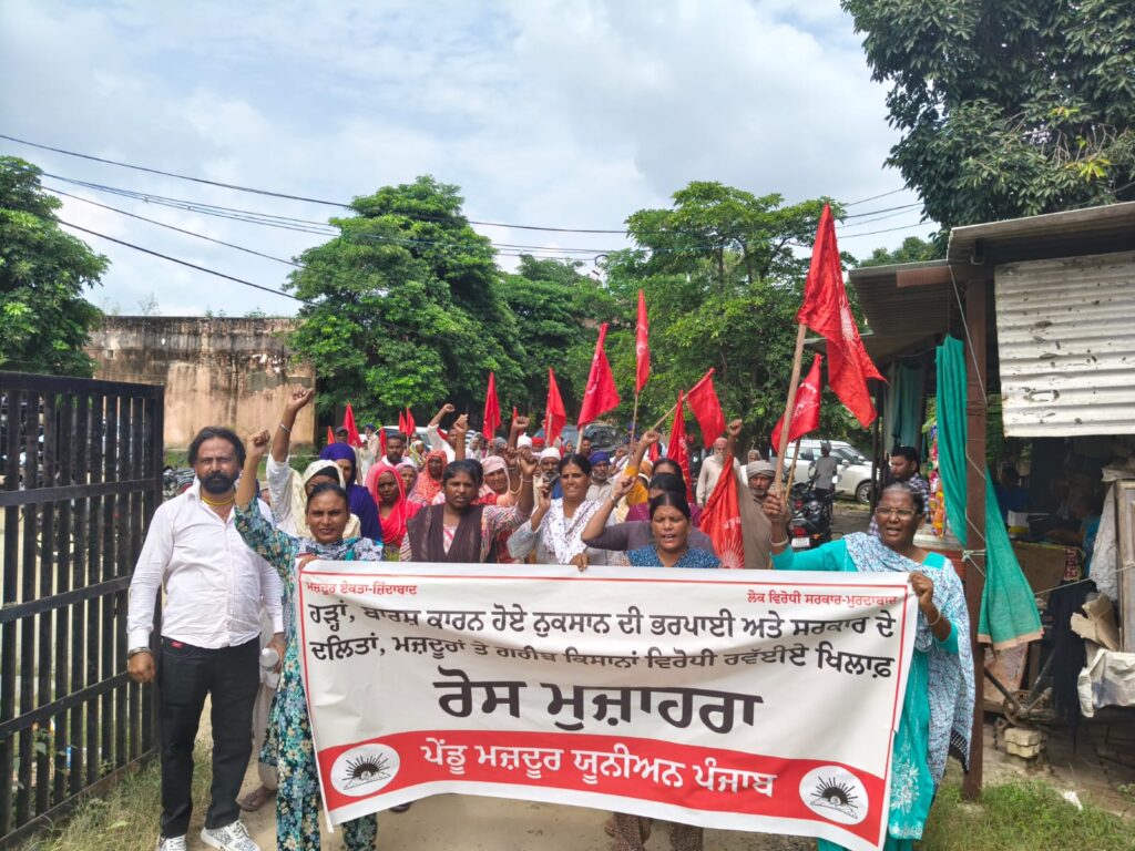 Punjab Floods – ग्रामीण और खेत मजदूर संगठनों के संयुक्त मोर्चे के आह्वान पर ग्रामीण मजदूर संघ पंजाब ने तहसील कार्यालय करतारपुर पर जोरदार नारेबाजी करते हुए धरना दिया और प्रधानमंत्री व मुख्यमंत्री के नाम तहसीलदार को ज्ञापन सौंपा। इससे पहले, प्रदर्शनकारी मुख्य चौक पुल के नीचे एकत्र हुए, जहाँ से वे प्रदर्शन करते हुए तहसील कार्यालय पहुँचे।